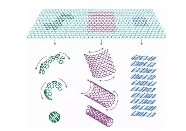 圖1.2石墨烯原子結(jié)構(gòu)圖及它形成富勒烯、碳納米管和石墨示意圖