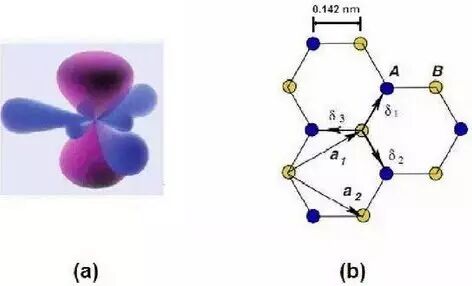 圖 1.1(a)石墨烯中碳原子的成鍵形式 (b)石墨烯的晶體結(jié)構(gòu)。