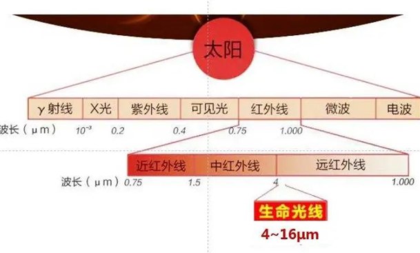 紅外線是一種電磁波,它占據太陽輻射能量的80%。迄今為止統稱為紅外線的電磁波分為近紅外線、中紅外線和遠紅外線三種。太陽放射出包括γ射線在內的所有波長的電磁波,但只有波長為4-1000微米的電磁波才是遠紅外線。如果按溫度來換算的話,相當于450℃至-270℃,即較低溫度的放射體發出的電磁波就是遠紅外線。