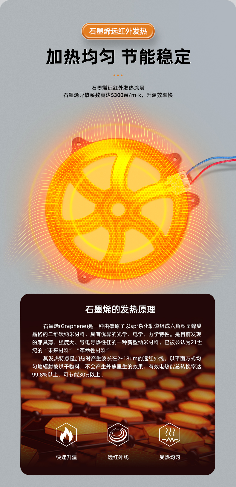 ①具有遠(yuǎn)紅外功能的石墨烯發(fā)熱材料,其特性是將電能轉(zhuǎn)化為遠(yuǎn)紅外線輻射,從而進(jìn)行加熱。